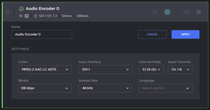 To connect this audio encoder to a stream, see Configuring Streaming.