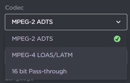 in the audio encoder panel you wish to modify. For the Codec, select either MPEG-2 ADTS, MPEG-4 LOAS/LATM, or 16-bit Pass-Through.