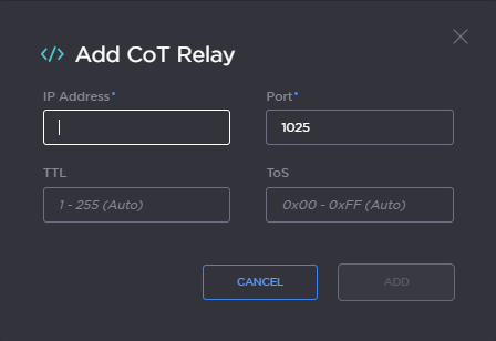 On the Add CoT Relay dialog, enter the IP Address and Port for the destination.