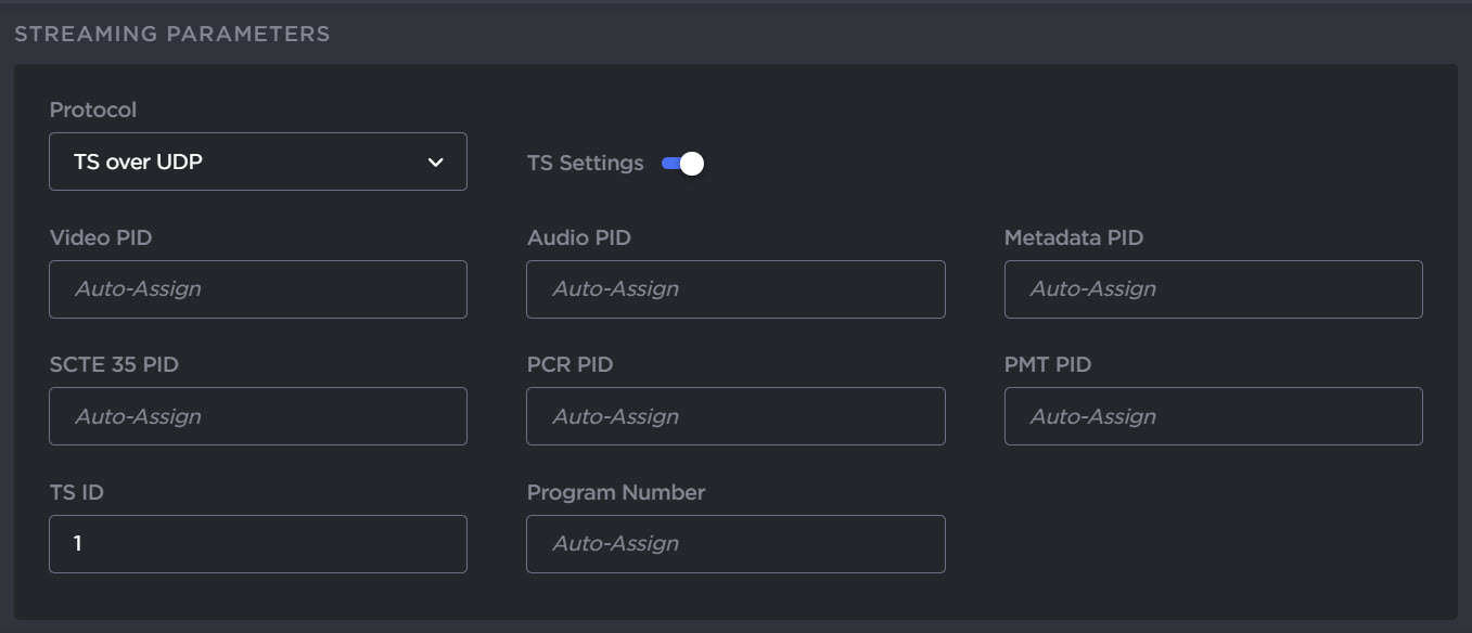 Under Streaming Parameters, select the Protocol. Optionally, toggle the TS Settings on and configure the additional parameters.