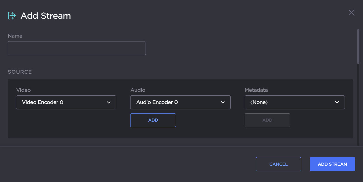 Type a Name for the stream, and under Source, select the video and audio encoders you started in the previous steps (above).