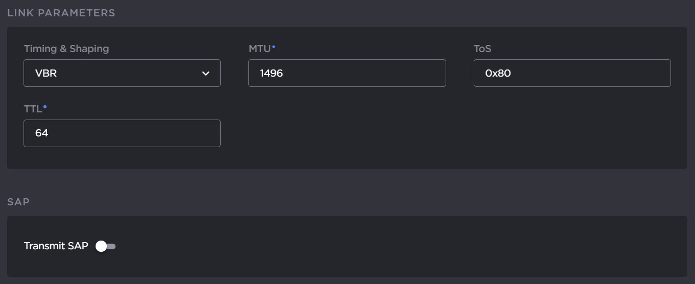 When applicable, configure the Link Parameters, and toggle Transmit SAP on to configure the SAP parameters.