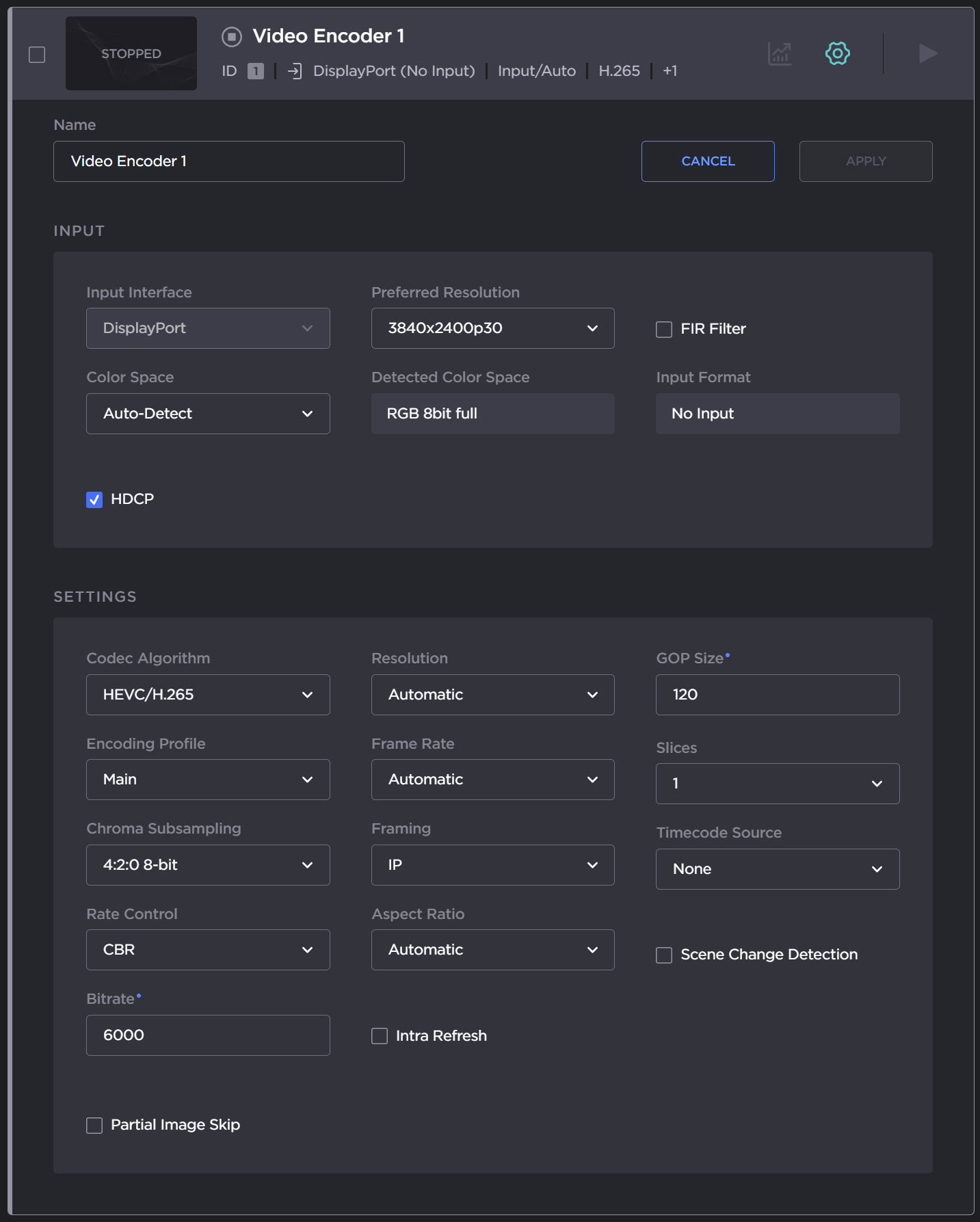 The Video Encoder Detail View opens, displaying the settings for the selected video encoder.