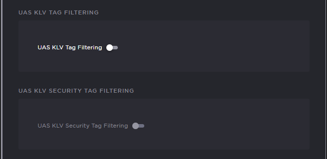 UAS KLV Security Tag Filtering:Toggle UAS KLV Security Tag Filtering on to filter tags that are not compliant with the Security Local Data set inside the UAS, see UAS KLV Tag Filtering.