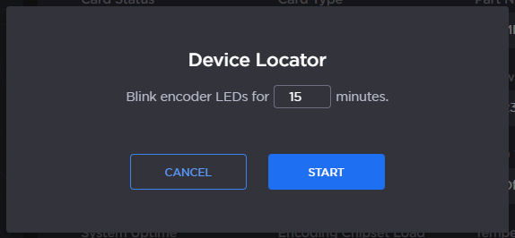 To initiate blinking of the status LED, click Locate. On the Device Locator dialog, adjust the time allowed to blink the encoder LEDs and click Start.
