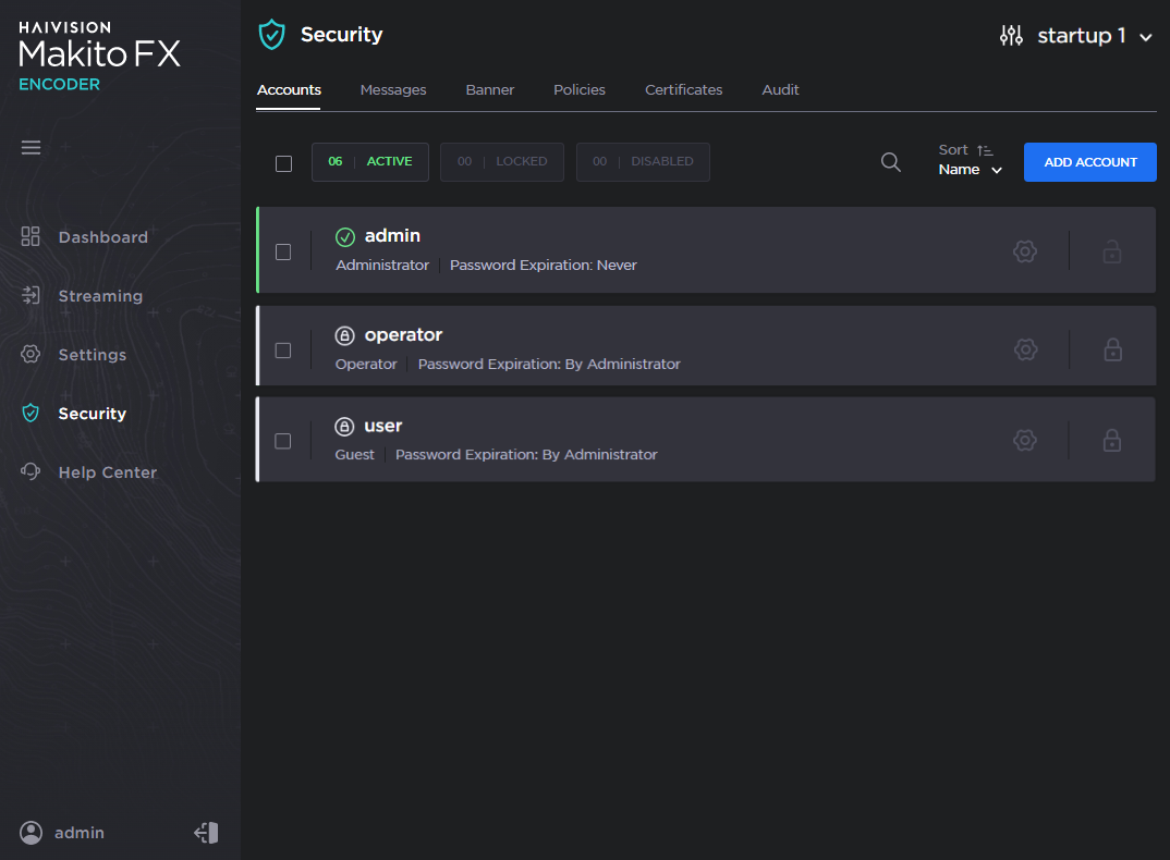 The Accounts List View opens, displaying the list of defined user accounts for the encoder.