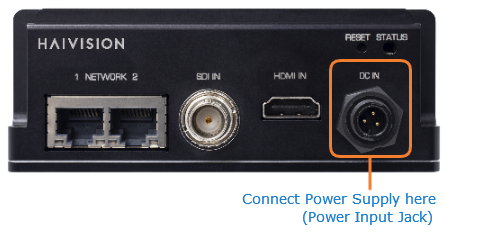 Insert the 3-pin connector on the 12V power supply into the Power input jack at the front of the MFX.
