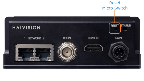 Factory Reset: If the problem remains after performing a reset, it may help to restore the encoder to its factory default settings. A factory reset returns the encoder to the same settings it originally had when shipped from Haivision, including the factory default IP address, subnet, and gateway.