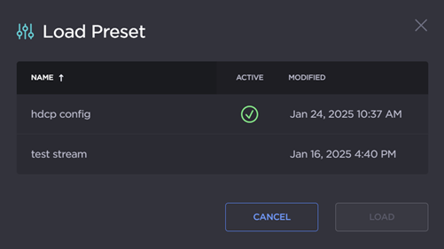 To apply an existing preset, click Load. The Load Preset panel opens. Select the preset configuration from the list and click Load.