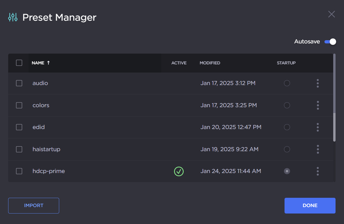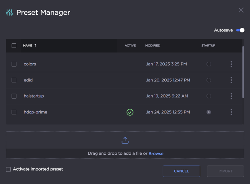 To automatically load the preset upon import, check the Activate imported preset checkbox. If autosave is disabled, this checkbox will read as Activate imported preset and set as startup instead. Once imported and loaded, the preset will be highlighted in the preset list.