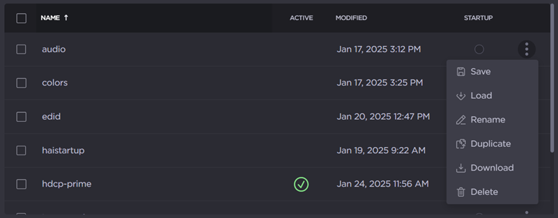 To load an existing preset into the current session, click the vertical ellipsis menu in the preset row and click Load.