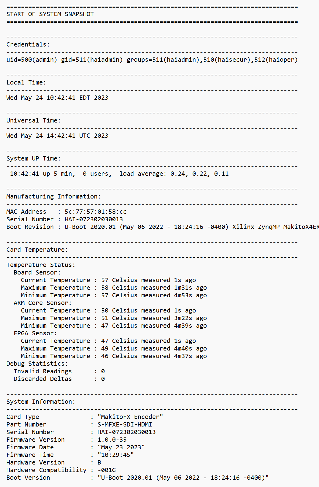 Taking a system snapshot can be useful for troubleshooting and may be forwarded to Haivision Technical Support if you are requesting technical support.