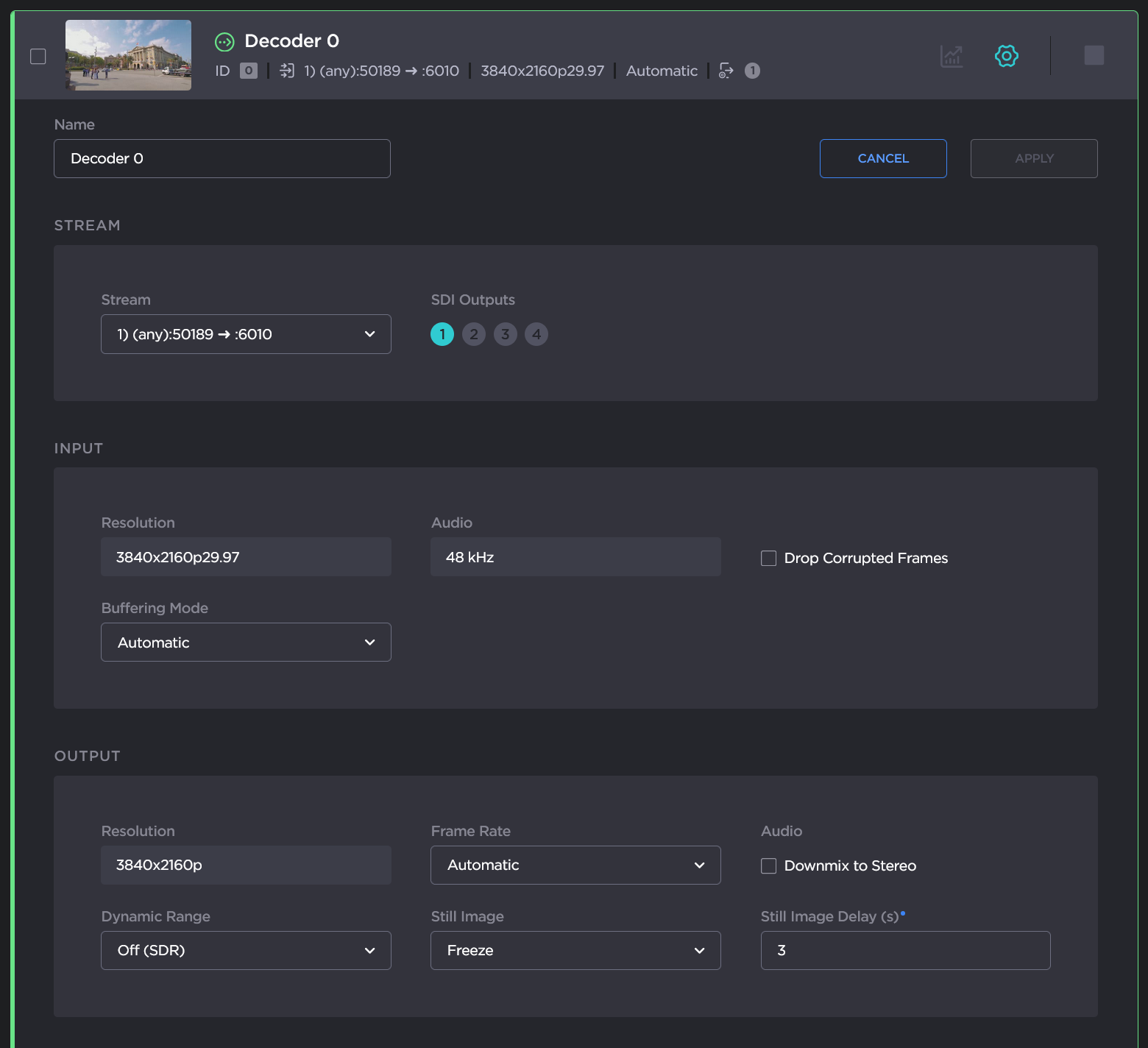 Select the Output port(s) for the decoder (if not using the default selection) by clicking 1, 2, 3, or 4 under SDI Outputs. You can route the decoded video and audio to any set of physical outputs. This allows you to specify the interface(s) on which you want to see the video.