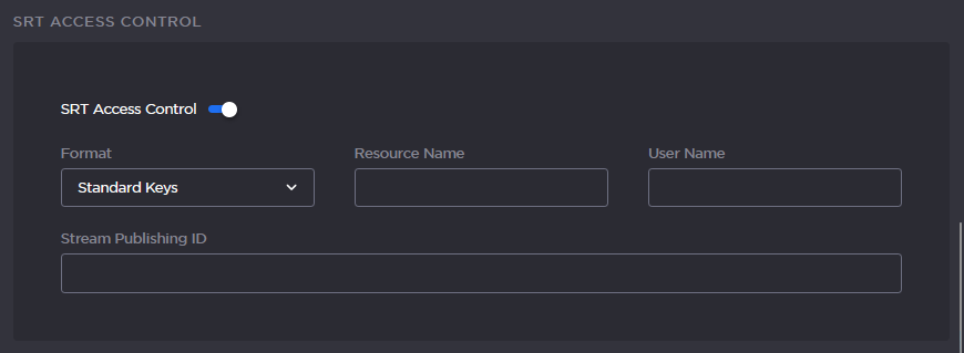 When applicable, turn on the SRT Access Control toggle and fill in the necessary parameters. See Configuring SRT Access Control.