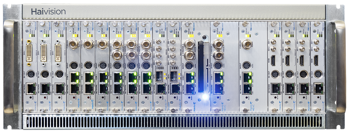 as a blade within a 4RU chassis (MB21) that can contain up to 21 single-height or ten dual-height Makito X Series or other Haivision encoder/decoder blades.
