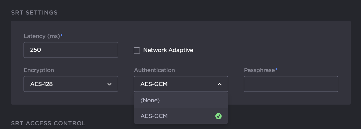 Authentication options in Caller and Rendez-vous modes are None (default) or AES-GCM. Authentication options in Listener mode are Auto (default) or AES-GCM.