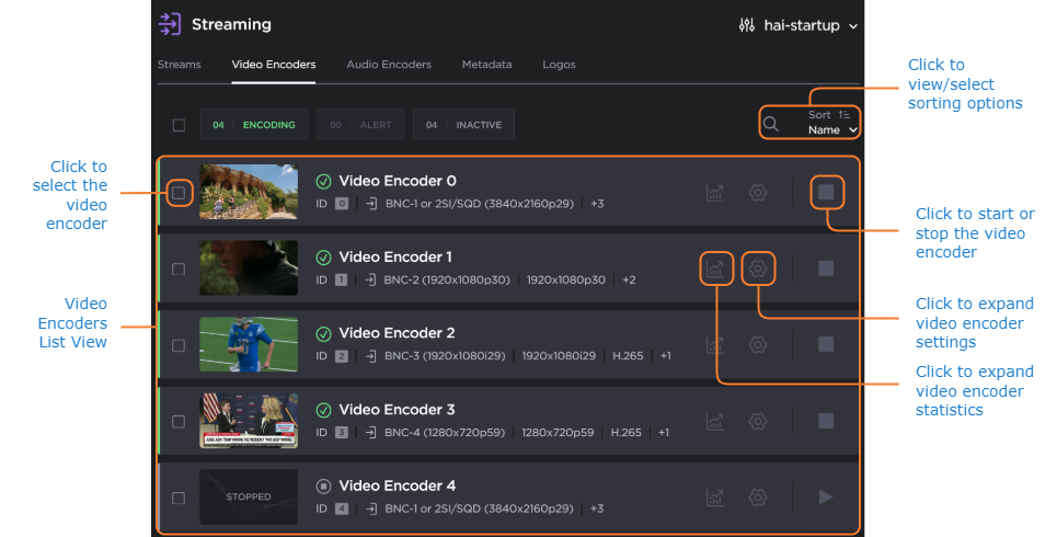 The Video Encoders List View opens.The Video Encoders List View displays the status, Name, Input format, Resolution, Codec (Algorithm), and Bitrate for each video encoder.