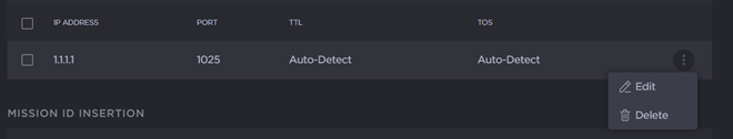 To delete a CoT relay destination, check the check-box on the relay stream panel and click Delete, or select Delete from the vertical ellipsis menu.