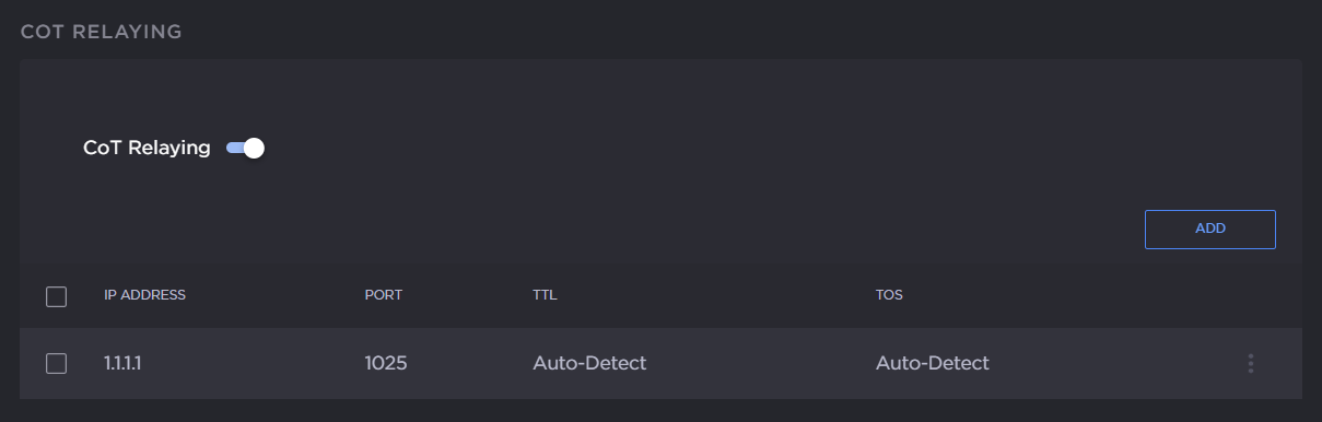 On the Add CoT Relay dialog, enter the IP Address and Port for the destination. Adjust the TTL and TOS values if required.