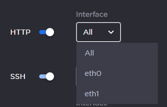 (If multiple network interfaces are available) For each service, you can select the applicable interface (All, eth0, or eth1) from the Interface dropdown menu.