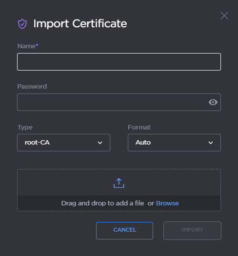 On the Import Certificate dialog, type in the Name and complete the remaining fields. See "Import Identity or CA Certificate dialog" in Certificate Settings.