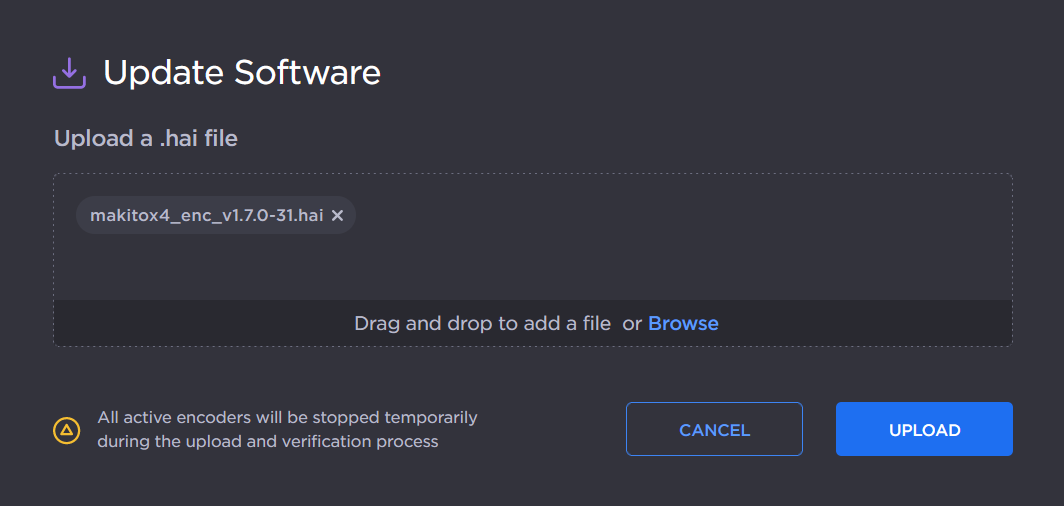 The firmware upgrade comes in the form of a file with the extension .hai, which when loaded will replace the application on your Makito X Series appliance. The firmware upgrade components are digitally signed, and these signatures are all verified before performing the installation.