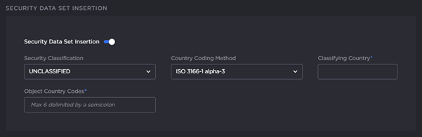 Security Data Set Insertion: Enable or disable the update/generation of the security data set in UAS messages: When this feature is enabled, you then specify the classification (Unclassified, Restricted, Confidential, Secret, or Top Secret), the classifying country, and the object country/ies (up to 6) (using the proper ISO 3-letter country code).