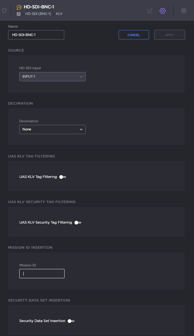 Mission ID Insertion: Configure a mission ID string of up to 127 characters: When the mission ID is configured, any received UAS KLV dataset will be processed in order to modify the existing mission ID or add a mission ID element if not there with the configured value.