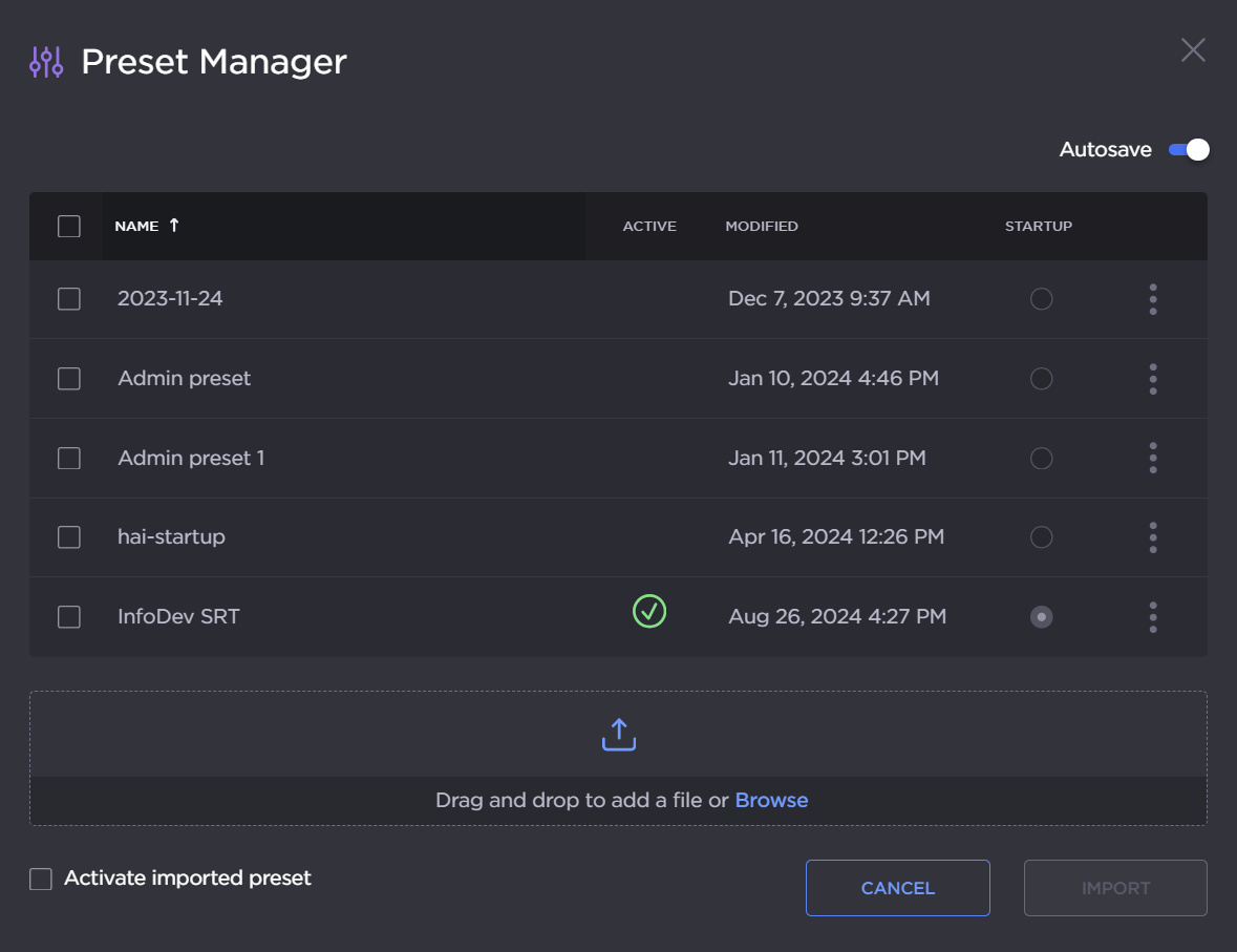 To automatically load the preset upon import, check the Activate imported preset checkbox. If autosave is disabled, this checkbox will read as Activate imported preset and set as startup instead. Once imported and loaded, the preset will be highlighted in the preset list.