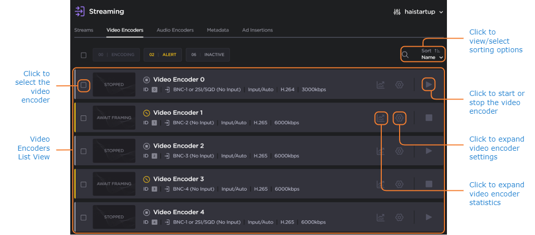 Click Streaming on the sidebar, and select the Video Encoders tab. The Video Encoders List View opens.