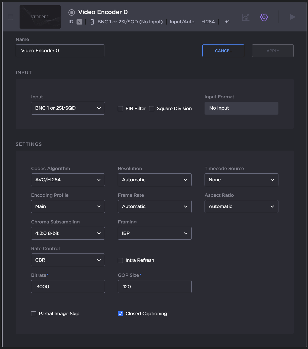 on the encoder panel to open the Video Encoder Detail View, displaying the settings for the selected video encoder.