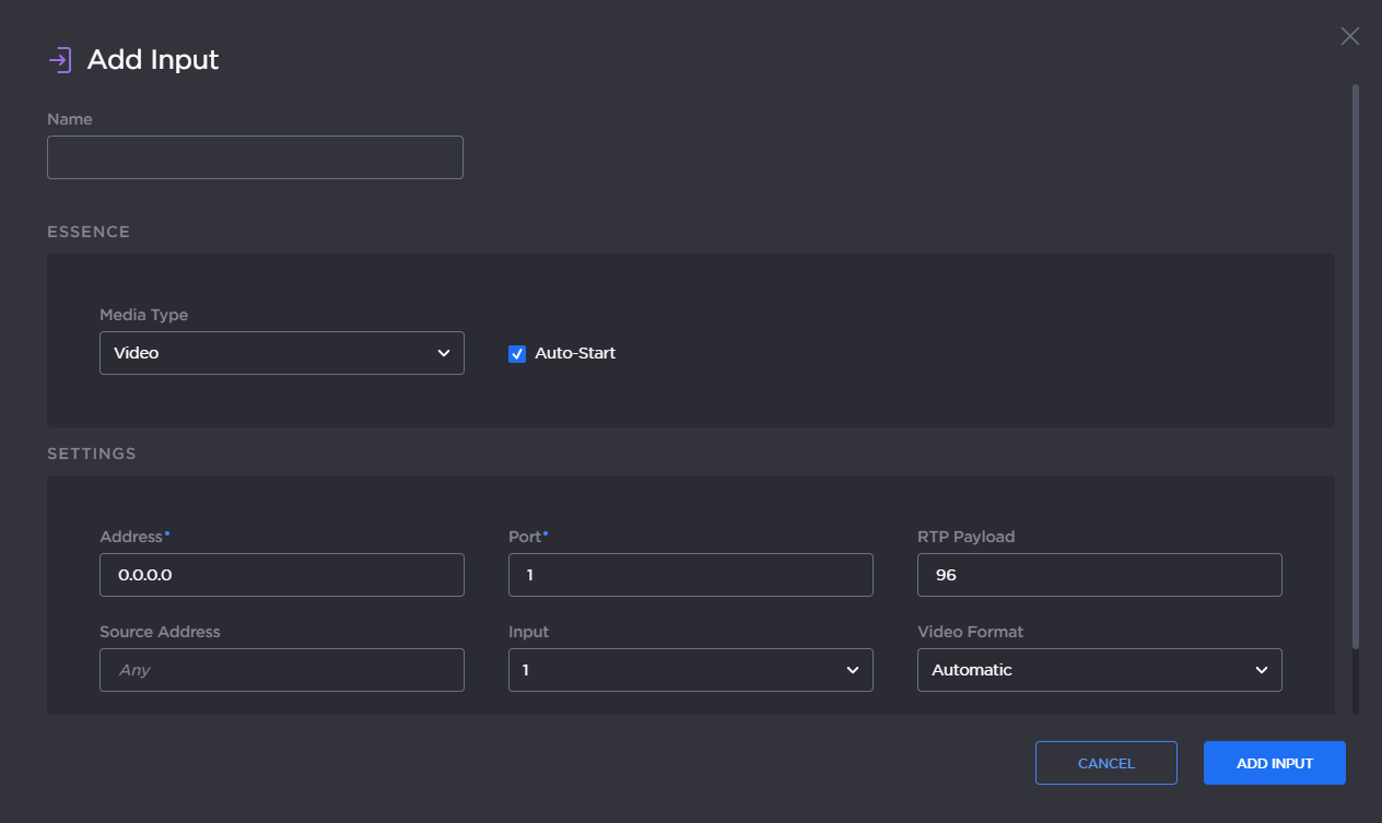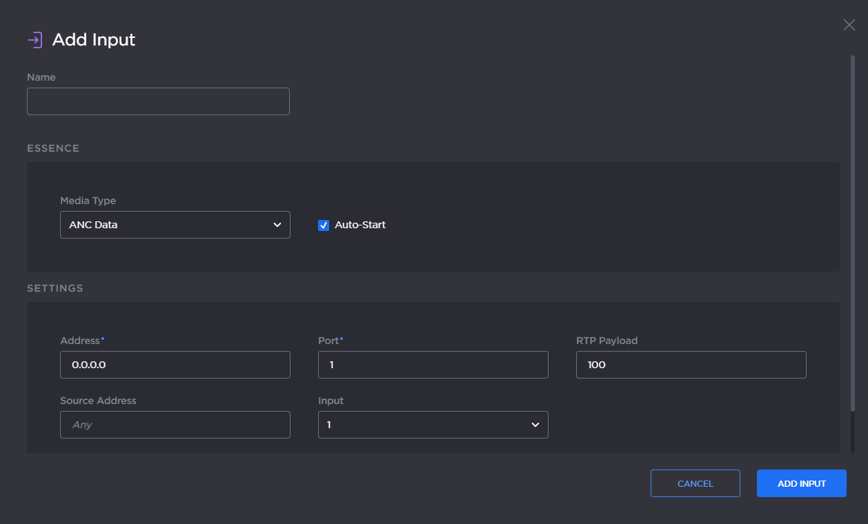 From the Input Essence Detail View, you can create and configure ST 2110 media essence inputs. For each input, you need to select the Media Type – either video, audio or ancillary data – as well as the Input number (1...4). The encoder supports running four (4) inputs of each Media Type at the same time.