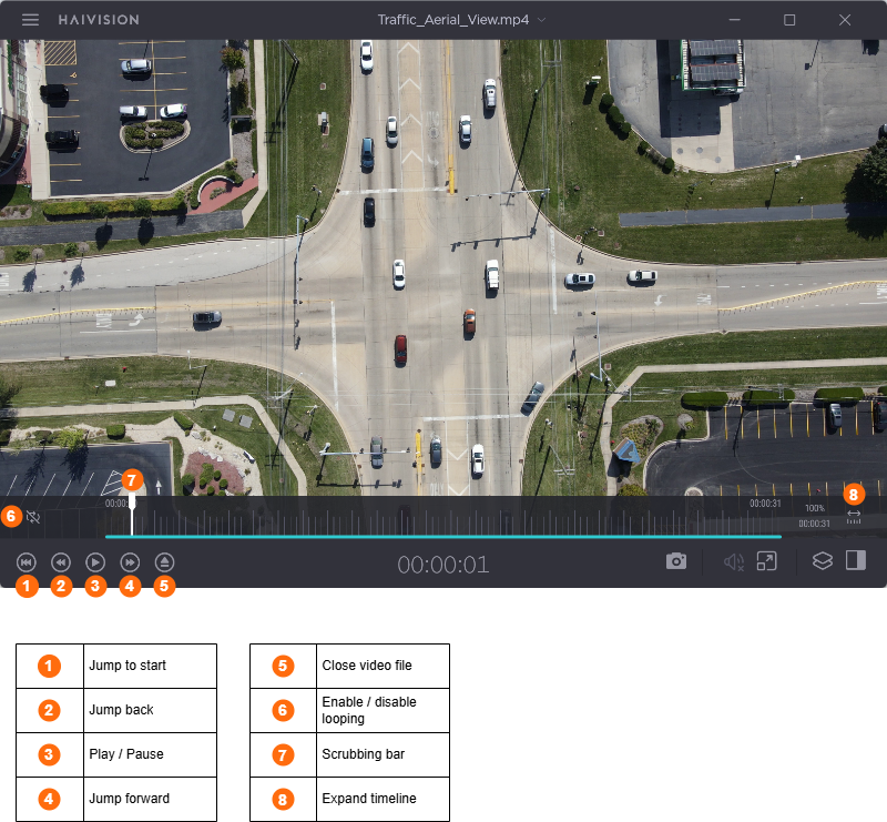 Once your file is uploaded, the player will display the running video on the main page. From here, you can use the control bar to manage your file playback, as shown in the following diagram.