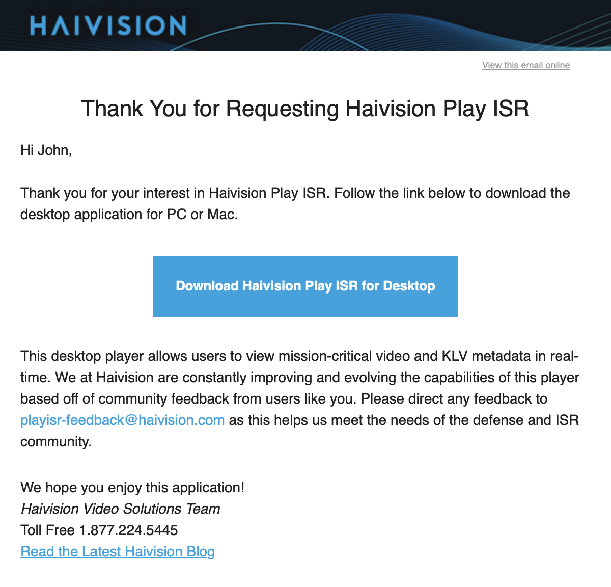 Once you've located the email, click Download Haivision Play ISR for Desktop.