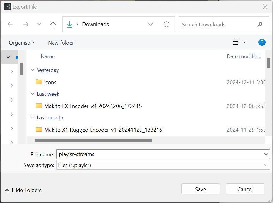 By default, export file names of individual streams will use the saved stream names, and exports of all streams will be saved as 'playisr-streams'.