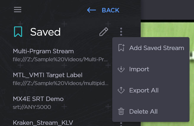 To export all saved streams click the More Options menu in the header, and click Export All.