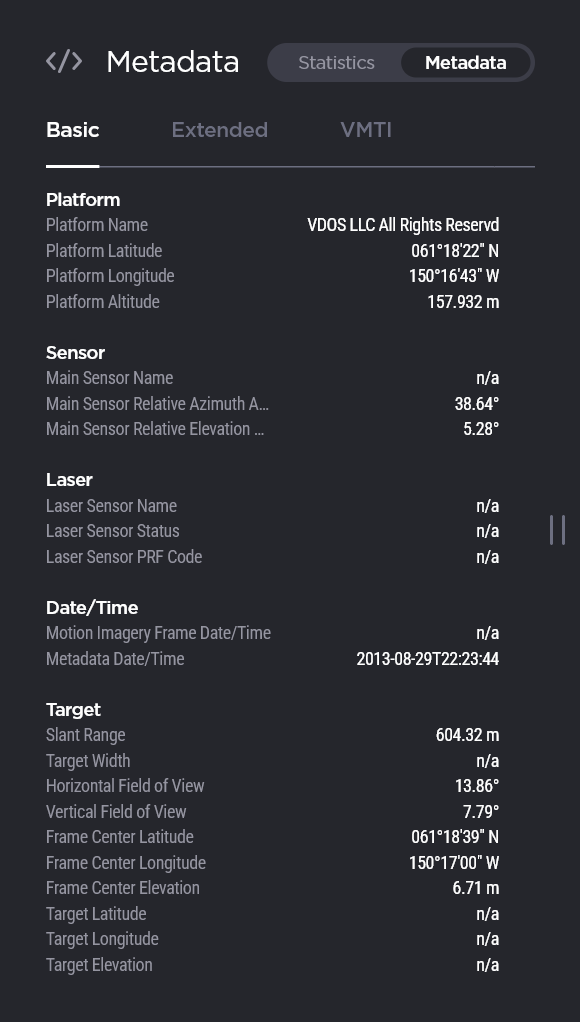 From the metadata tab, you can toggle between Basic, Extended, and VMTI (if available) metadata. For more information about VMTI, see Monitoring VMTI Metadata.