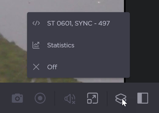 From this menu, select Metadata </> (when available, metadata overlays will be formatted according to MISB ST 1909 standards) or Statistics to display the corresponding information over the video feed.