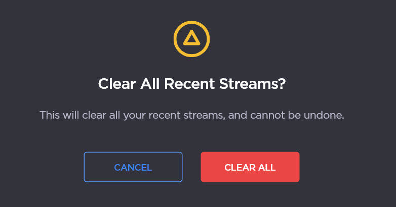 This action will clear all your recent streams. A warning will appear asking for your confirmation to clear all streams.