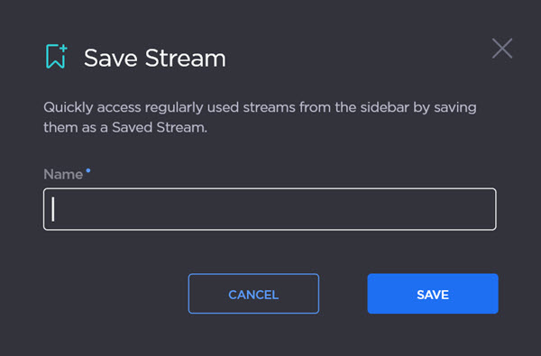 Add any of the streams in the list to your saved streams by clicking the Add to Saved icon next to the stream name. This will open the Save Stream panel, where you must type in a unique name for the stream, and click Save.