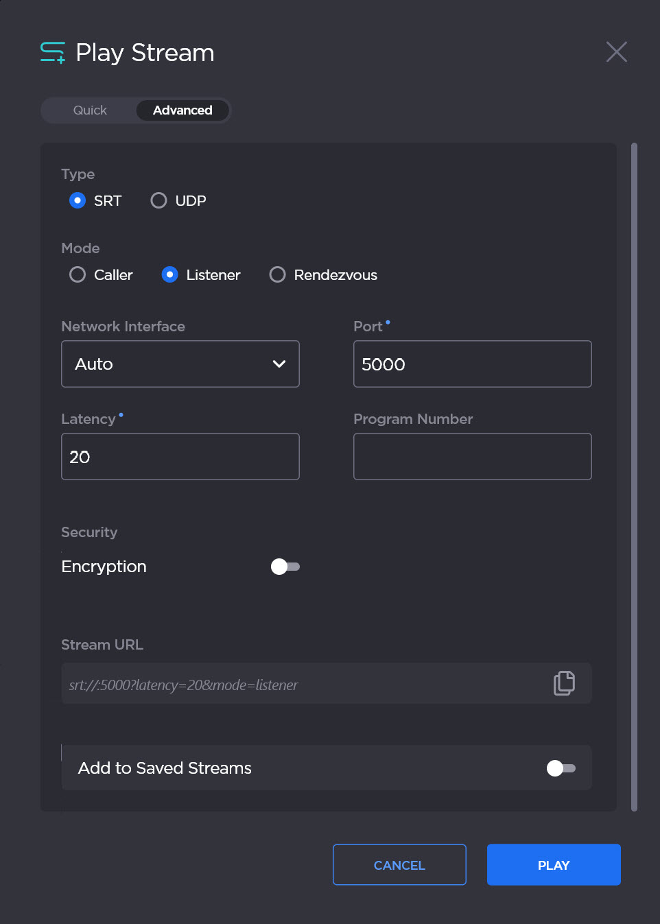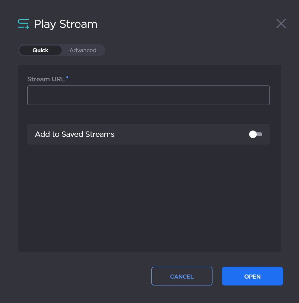 The Play Stream panel appears. - Type or paste in the URL of the stream you wish to play in the Stream URL field.
