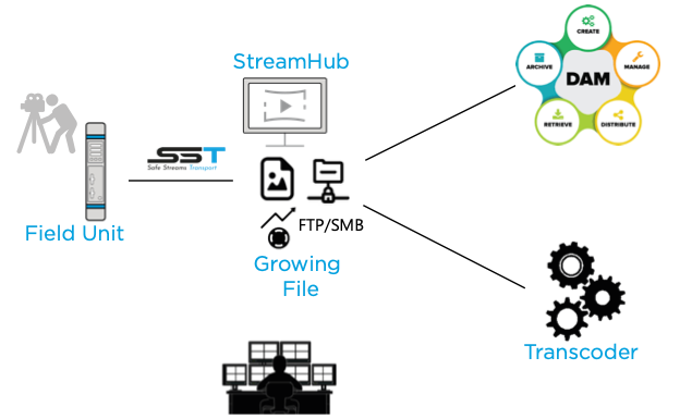 The StreamHub embeds FTP and Samba servers. You can then set up a watch folder application to automatically download files from the StreamHub server to your workflow.