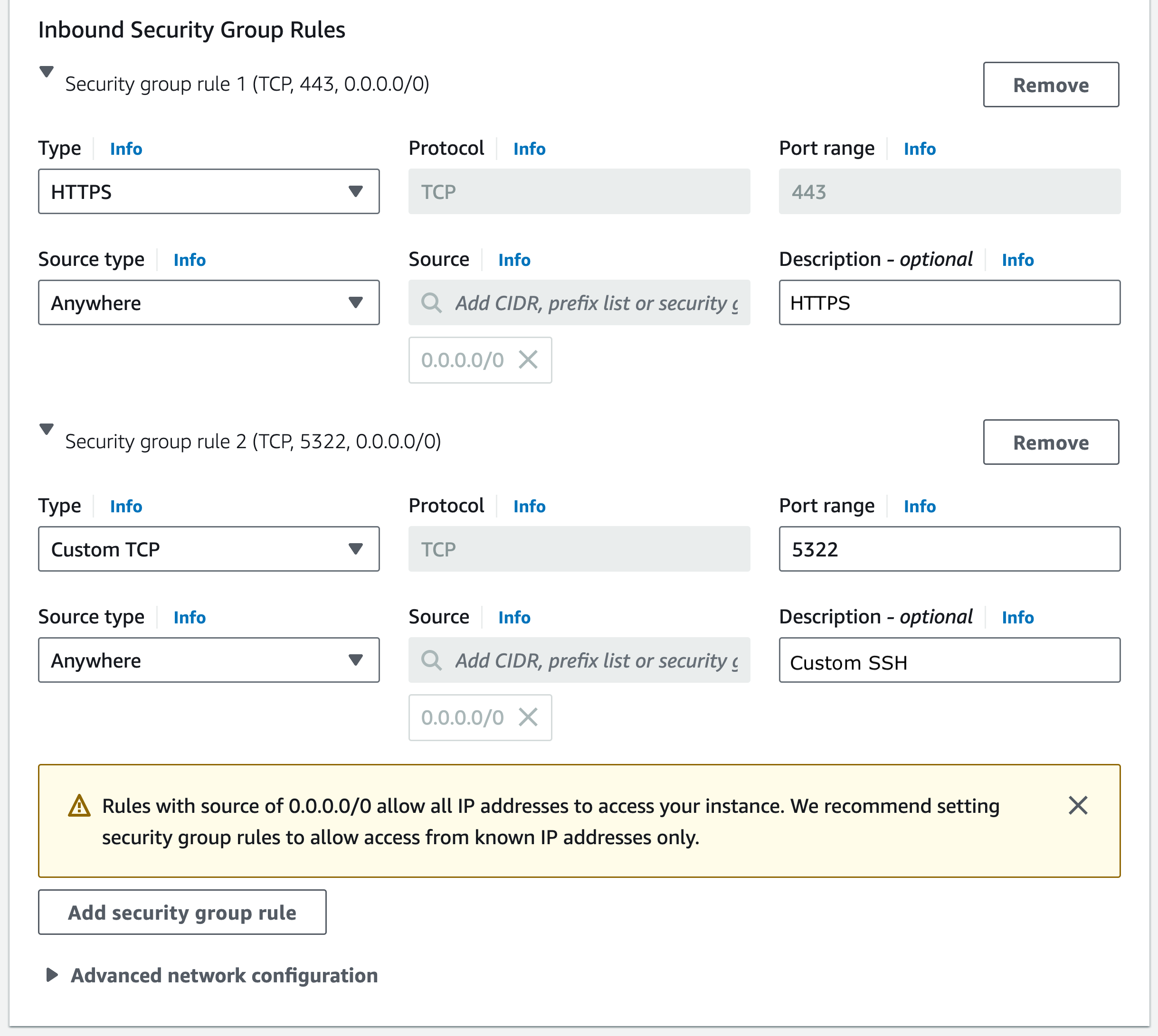 Click Add Rule and add new rule for SSH port 5322 (refer to the Network Port Requirements indications):