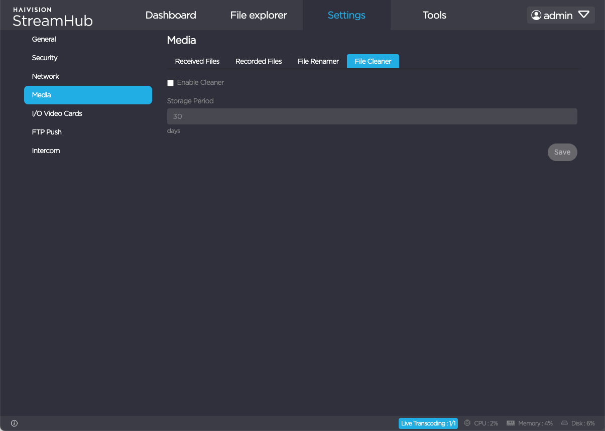 The File Cleaner tab allows you to enable StreamHub to automatically delete files on the server after a certain period of time. See Enabling the Media Cleaner for details.