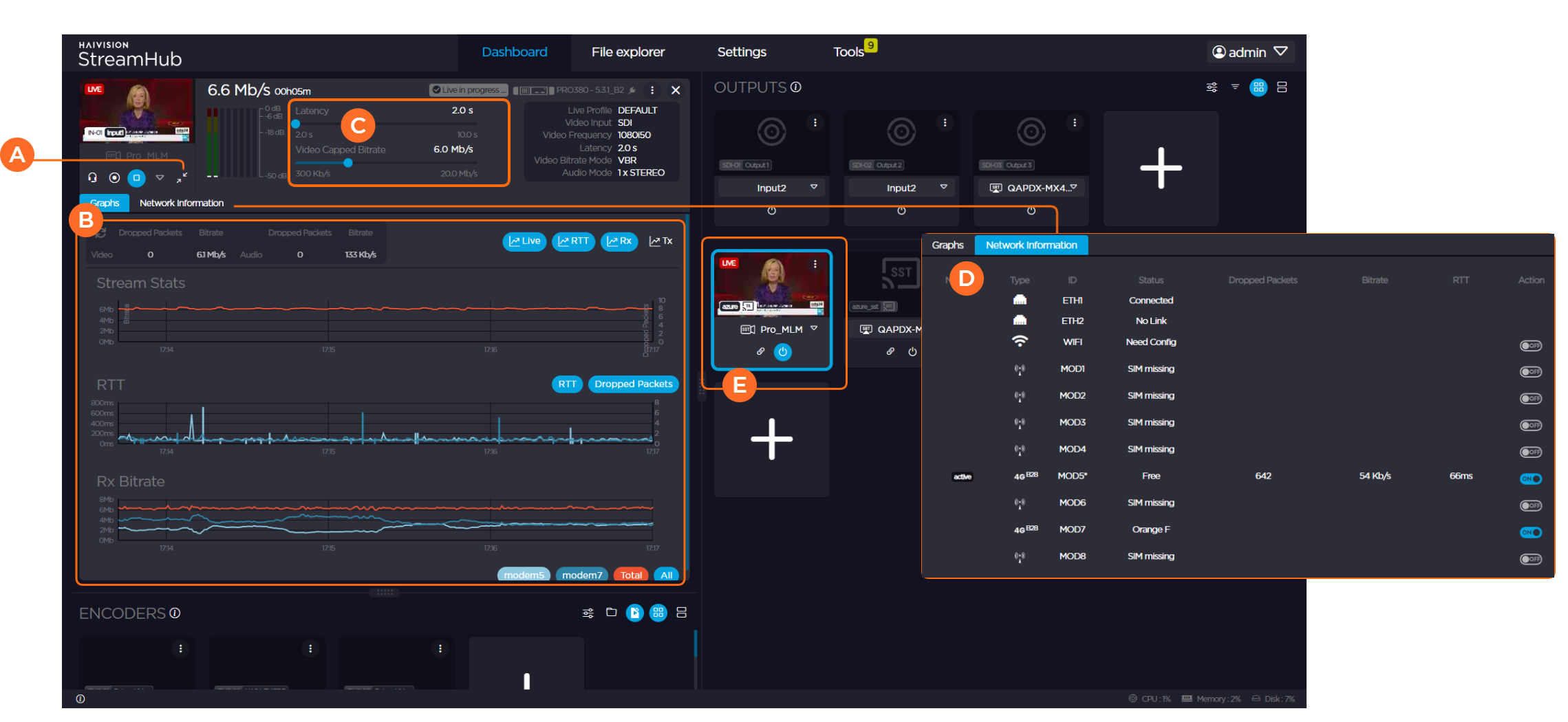 The quality of the output videos depends on the quality of the transmission. Your StreamHub allows you to monitor the performance of each transmission link, control the latency, and other transmission settings.