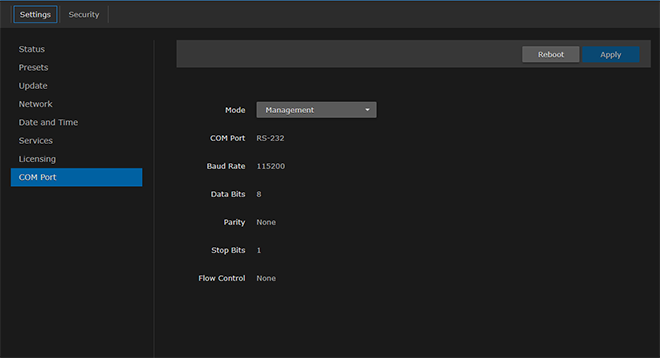 The Makito X Rugged Encoders provide a serial interface that you can use to connect to a computer for management of the encoder. The COM Port page displays the serial COM port settings and provides the option to switch from Metadata to Management mode.