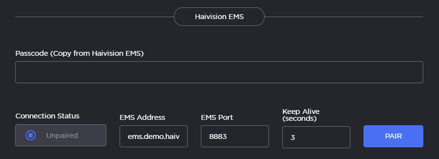 On a new system, the EMS Address and Port are blank. When a pairing code is pasted in, the address and port are automatically filled in to reflect the IP address and port contained in the pairing code.