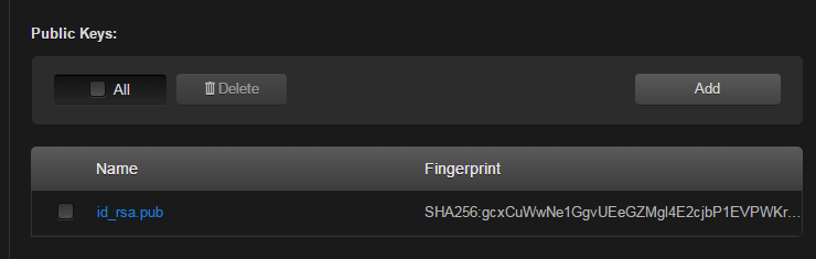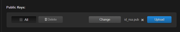 To delete one or more previously uploaded public key file from the list, check the checkbox next to one or more filenames (or check All) and click Delete.