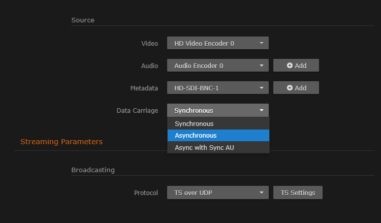 224.0.0.0to239.255.255.255. Multicast addresses from224.0.0.0to224.0.0.255are reserved for multicast maintenance protocols and should not be used by streaming sessions. We recommend that you use a multicast address from the Organization-Local scope (239.192.0.0/14).To add metadata to the stream, select the Metadata source, and (optionally) select the encapsulation type (Data Carriage).