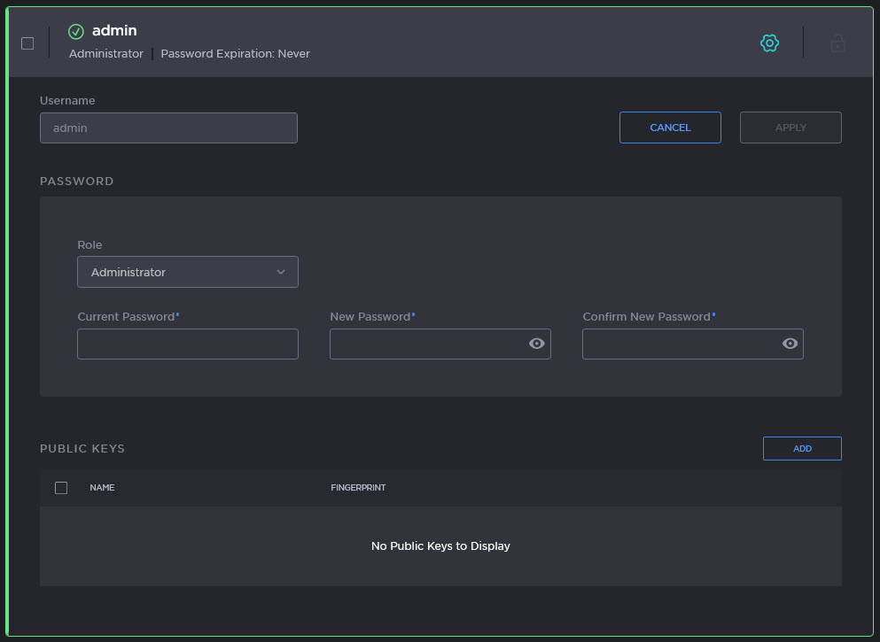 To change your own password, type the current password in the Current Password field, type the new password in the New Password field and again in the Confirm Password field.
